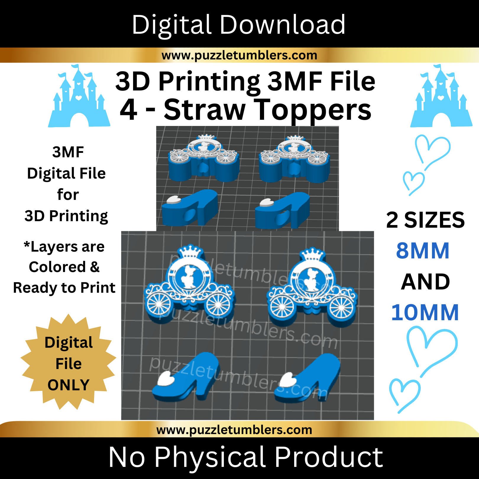 "Princess Theme" Straw Toppers 8mm & 10mm | 3D Print File (3MF) | Desk Organizer | Digital Download